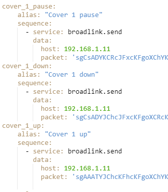 | cover_1_pause: alias: “Cover 1 pause” sequence: – service: broadlink.send data: host: (자신의 broadlink IP 주소) packet: ‘학습 시킨 코드 입력 부분’ cover_1_down: alias: “Cover 1 down” sequence: – service: broadlink.send data: host: (자신의 broadlink IP 주소) packet: ‘학습 시킨 코드 입력 부분’ cover_1_up: alias: “Cover 1 up” sequence: – service: broadlink.send data: host: (자신의 broadlink IP 주소) packet: ‘학습 시킨 코드 입력 부분’ ————–(아랫부분은 블라인드가 2개인경우 해당)———————– cover_2_pause: alias: “Cover 2 pause” sequence: – service: broadlink.send data: host: (자신의 broadlink IP 주소) packet: ‘학습 시킨 코드 입력 부분’ cover_2_down: alias: “Cover 2 down” sequence: – service: broadlink.send data: host: (자신의 broadlink IP 주소) packet: ‘학습 시킨 코드 입력 부분’ cover_2_up: alias: “Cover 2 up” sequence: – service: broadlink.send data: host: (자신의 broadlink IP 주소) packet: ‘학습 시킨 코드 입력 부분’ |