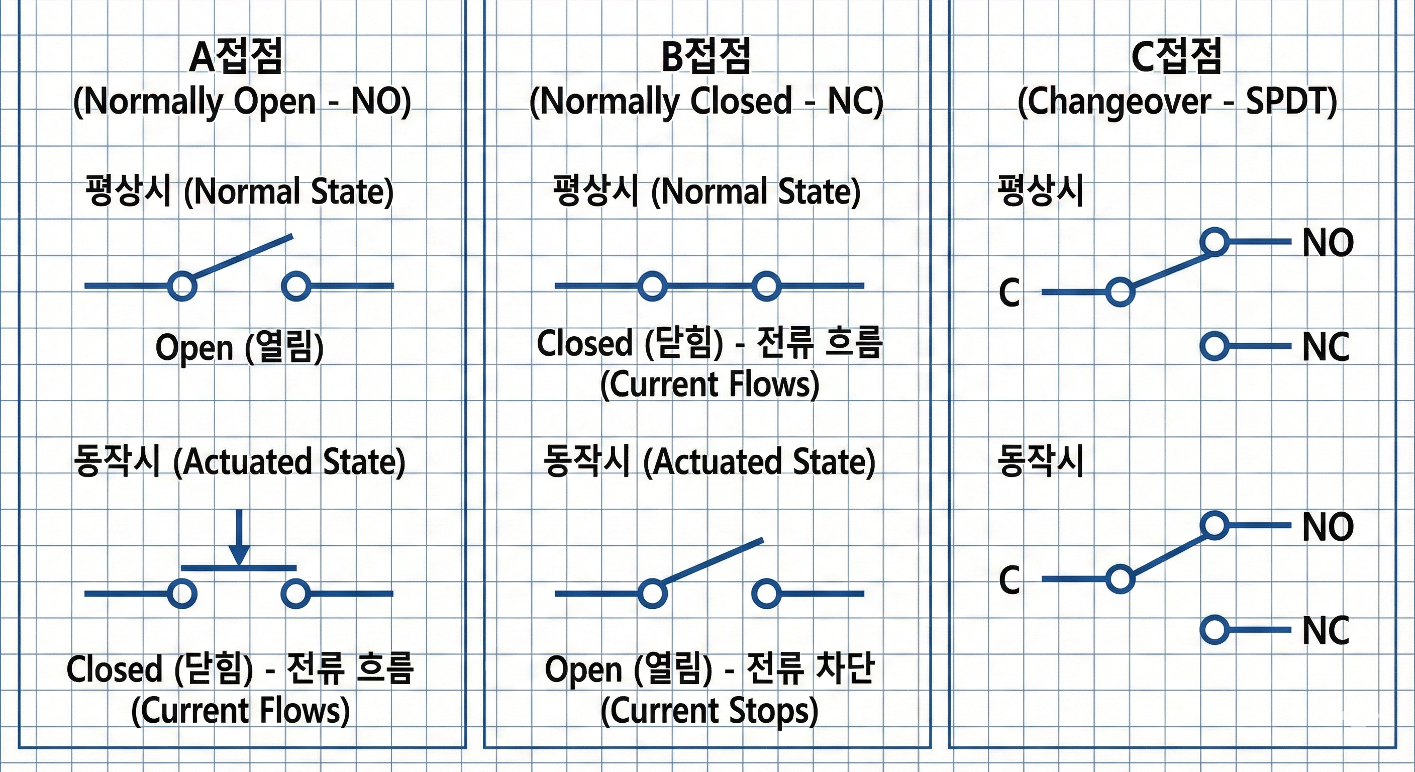 - C접점 (Changeover): 하나의 공통 단자(Common)를 기준으로 A와 B가 동시에 존재하는 형태.