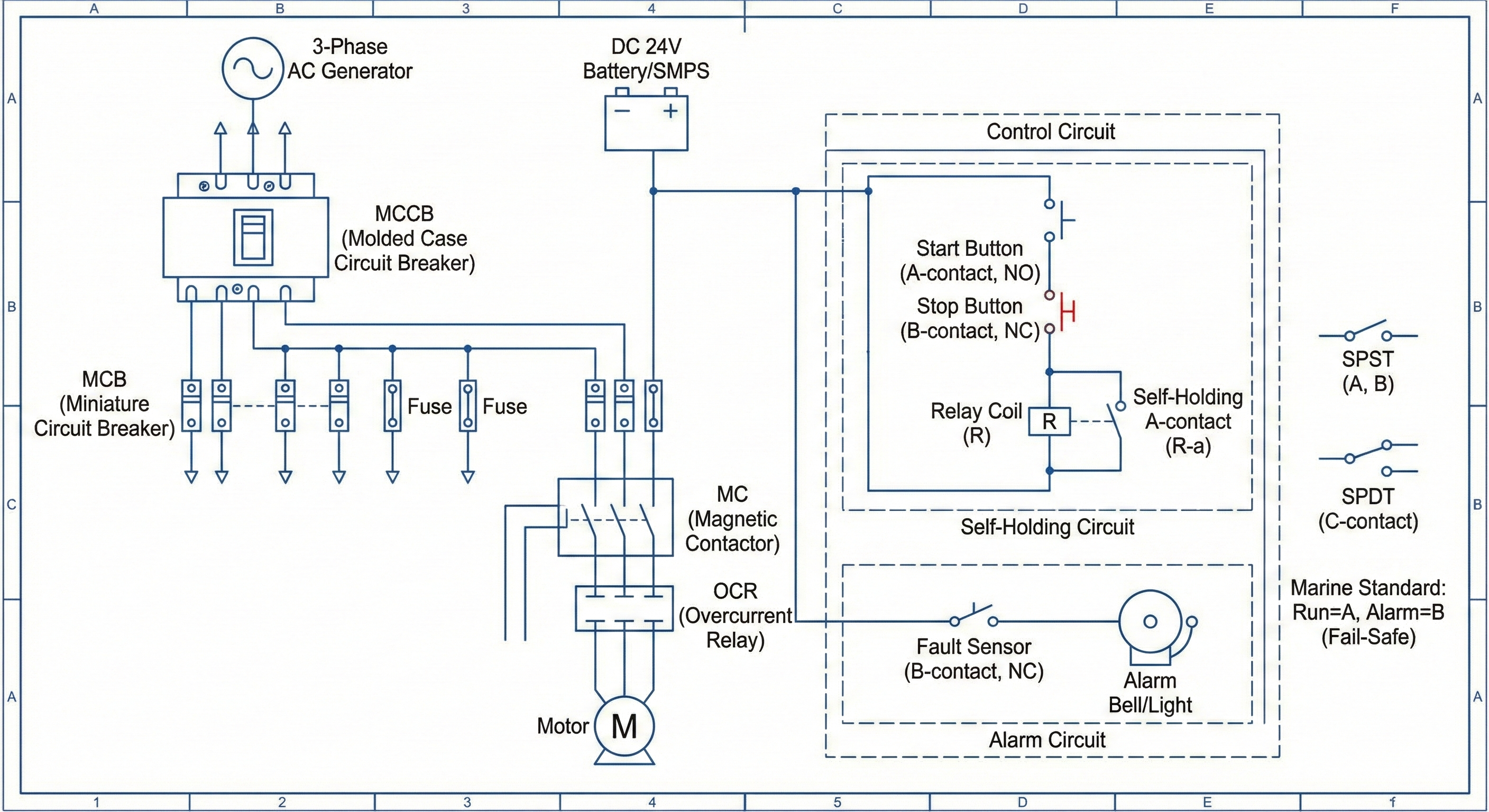 - 알람 (Alarm/Fault) → B접점 사용 (선박 표준):