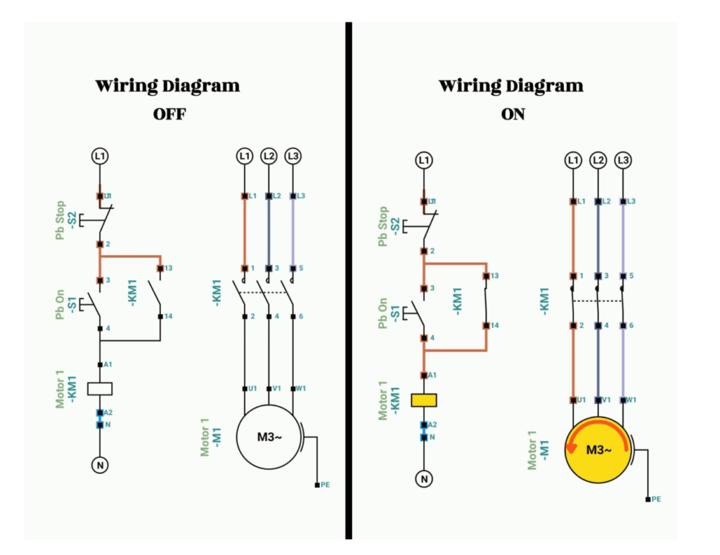 - 사람이 Start 버튼에서 손을 떼어도, 전기는 병렬로 연결된 릴레이 A접점을 타고 계속 코일로 공급됩니다. (스스로 길을 유지함 = 자기유지)