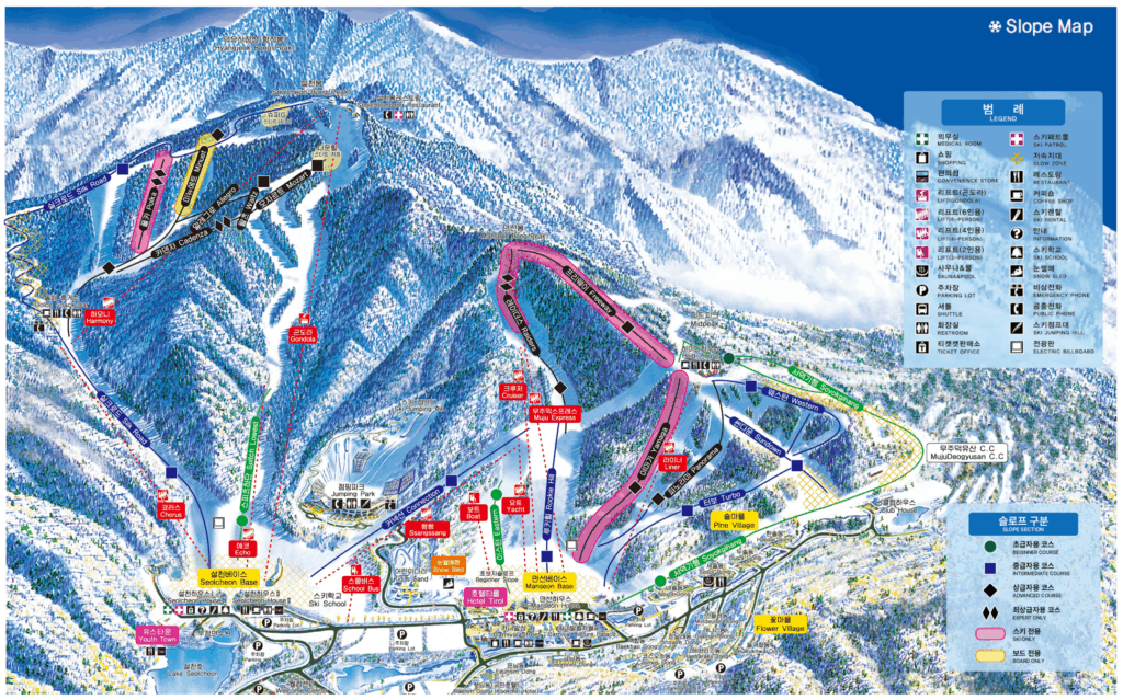 무주 스키장은 총 34면의 슬로프를 갖춘 국내 최대 규모 중 하나입니다.